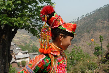 云南巍山彝族回族自治縣各民族如壯麗的織錦,將生活裝扮得五彩繽紛,充滿詩(shī)情畫意。其中特別是東山一帶的彝族服飾色彩較為豐富,款式變化多姿,并且以大量的銀制品和刺繡裝飾,制作工藝之精良,堪稱少數(shù)民族服飾一絕。以小孩帽而言,就有魚尾帽、小瓢帽、銀鼓帽、花帽和搭耳帽等數(shù)十種,名目繁多,式樣各異。帽子上都繡有花草、樹葉、龍鳳圖案,鑲嵌著閃亮的銀首飾,十分逗人喜愛。小孩的衣服式樣也很多,大多由紅、藍(lán)、綠、白幾種顏色的布料縫制而成,紅綠交織,藍(lán)白相襯,非常艷麗。如花朵一般的彝族少女通常頭戴銀鼓帽,墜耳環(huán)、身穿藍(lán)領(lǐng)褂,腰系花圍裙,下著綠彩褲,背掛圓裹背。銀鼓帽和繡花鞋做工極為精巧,全套裝飾花團(tuán)錦簇,恰似一只開屏的孔雀。結(jié)婚后的婦女就不再戴帽子,改為結(jié)發(fā)髻,裹包頭。發(fā)髻一般呈寶塔狀,外裹黑紗和黑布包頭,發(fā)髻上戴“別子”?!皠e子”其實(shí)就是發(fā)卡,均為銀制品,分為四串,每串有兩個(gè)燈籠繡球,兩個(gè)響鈴和兩尾小魚。包頭巾外再用銀串珠、亮球飾之。上衣著右衽大襟,前短后長(zhǎng)、領(lǐng)、袖及襟邊則鑲以多層不同的金銀絲瓣或自繡花紋的多層寬窄不同的花邊。外罩齊腰藍(lán)布短領(lǐng)褂,領(lǐng)口上安裝著七個(gè)用銀鼓釘湊成五個(gè)葉子,狀如葵花形,彝語(yǔ)叫“披巴”的裝飾。領(lǐng)褂四周皆用銀鼓釘鑲邊,共四排,每排36顆。一件領(lǐng)褂上需有兩百多顆銀鼓釘,加上胸前佩戴銀制的“三須”針筒,“菱角吊”串珠和雞心型繡花荷包,整個(gè)裝飾真是銀裝素裹,分外嬌嬈。腰間系的圍腰布上,鑲嵌多層金銀絲瓣或自繡圖案的花邊。圖案有串枝蓮、牡丹花、太陽(yáng)花及鳳戲牡丹、丹鳳朝陽(yáng)等。無論未婚和已婚婦女,背上都有一個(gè)用羊毛搟制而成的圓型繡花裹背,直徑約一尺不等,內(nèi)外兩層,中可承物,上繡兩對(duì)太陽(yáng)花,一大一小,對(duì)稱排列。裹背除用作裝飾外,還可保護(hù)腰部,既有欣賞價(jià)值,又有實(shí)用價(jià)值,這在巍山彝族服飾中是最為典型的一件飾物。銀鼓帽繡有42朵小花,鑲有96顆銀鼓釘,帽頂插有花一朵或釘有櫻花一束。其帽形如金魚,魚頭魚身為帽,魚尾多岔分為護(hù)頸,亦稱為“魚尾帽”。繡花鞋呈船形或鳳頭形,鞋面繡有40余朵小花,紅色中夾有40余片綠葉。如果是新娘鞋,則用紅色或粉色的軟鍛做鞋面,更為講究。
