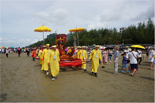 今年適逢中國共產黨成立100周年,活動當天,氵萬尾村洋溢著濃濃的愛國熱情。活動開始,身著京族服飾的當?shù)卮迕駠墼谄鞐U前,舉行升國旗奏國歌儀式。隨后迎神隊伍在鑼鼓和鞭炮聲中到達海邊,將“海神”迎回哈亭敬奉,祈求人畜興旺,五谷豐登(見圖)。眾多慕名而來的區(qū)內外游客集聚哈亭和海邊,與京族同胞一起歡慶這盛大的節(jié)日。