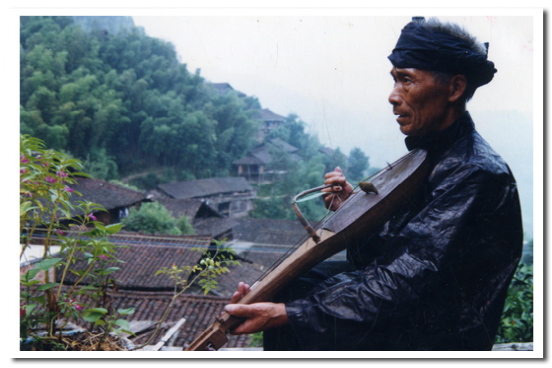 果哈是苗族唯一的古老的民間弓弦樂器,因其形似瓢,故苗語稱之為果哈(意即瓢琴),是唱古歌時(shí)不可缺少的伴奏樂器,一般以歌師自拉自唱為主。制作工藝比較粗糙,先選一段長60厘米、直徑為15厘米左右的鴨腳木或泡桐木制成琴身,在其二分之一的一端剜成瓢狀,封住薄板作共鳴箱。另一端修成琴柄,在琴柄頂端鉆孔安琴鈕,用棕繩、牛筋作琴弦,用竹片和綜絲制成弓。琴置兩弦,演奏時(shí)以人的唾液代替松香,演奏者時(shí)而將弓毛放入口中,讓弓毛增加溫度,增強(qiáng)與琴弦的磨擦,使之發(fā)音。果哈音量微弱,發(fā)音低沉,但音色獨(dú)特,與苗歌語調(diào)相當(dāng)協(xié)調(diào),較適合表現(xiàn)安靜、深沉情緒,故常為苗族敘事古歌伴奏。