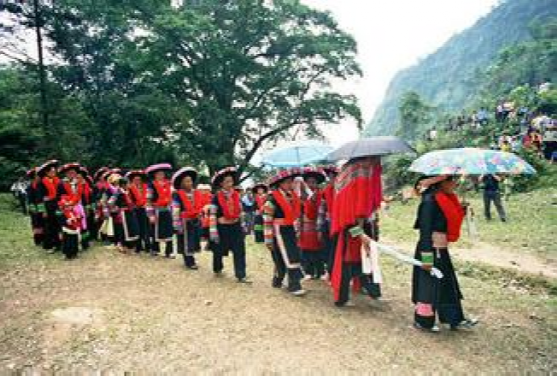 這里的"女婚男嫁"特點(diǎn),大體上有這么幾個階段。當(dāng)男女青年都長到18歲后,就開始講究修飾,喬裝打扮一新,女青年似花蕊朵朵,男青年個個英俊瀟灑。通過趕街、走親訪友、耍老表、節(jié)假日唱山歌,打陀螺,拋毽子等方式,進(jìn)行談情說愛,互相了解,這是認(rèn)識階段。在認(rèn)識基礎(chǔ)上,雙方互請到家做客,彼此進(jìn)一步掌握對方為人、性格,家庭成員,家庭經(jīng)濟(jì)等情況。這是加深認(rèn)識、了解、建立愛慕之情階段。每逢農(nóng)忙季節(jié)和節(jié)假日,女方總要請男方來幫助犁地、耙田,耕種,收割,蓋房子等,這是考察對方勤勞能干還是好逸惡勞階段,是最關(guān)鍵的階段經(jīng)過一兩年的交往接觸,雙方產(chǎn)生了深厚感情,女方就偷偷買布,精心地打好精致的布鞋送給男方,男方收到信物后,就選擇買手鐲、頭簪、戒指,耳環(huán)或手表等其中的一兩件送給女方,彼此作為定情物,確定自己的心上人。但是,這些交往仍然是在秘密的條件下進(jìn)行,屬保密階段。經(jīng)過以上四個階段以后,女方便請男方派老人帶上幾斤酒,糖,一些煙餅等禮品來訂親,要求上門,將婚事公布于眾,從這以后,女方就負(fù)責(zé)籌備一切嫁妝、床上用品、家具等。待東西備齊,女方就擇日接男方過門。