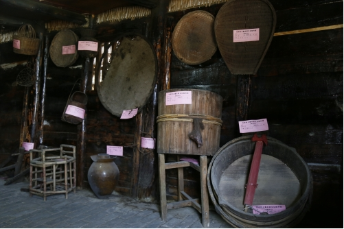 “農(nóng)耕文化陳列館”是由兩棟傳統(tǒng)的木質(zhì)民房改建,從大門進(jìn)來(lái),門的兩邊放置有農(nóng)具,右側(cè)一個(gè)是存儲(chǔ)糧食的倉(cāng)庫(kù),沿著倉(cāng)庫(kù)邊上的石階往上走,從小門進(jìn)去,大大小小的簸箕、飯甑、貓籮、魚籮等農(nóng)具應(yīng)有盡有。