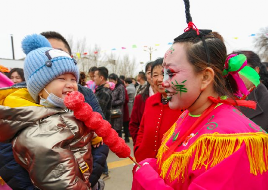 踩高蹺、秧歌、舞獅、腦閣、天倉舞、二人臺.....一個個精彩紛呈又獨具特色的民間傳統(tǒng)表演吸引著十里八鄉(xiāng)的村民和慕名而來的市民。大家或跟著哼唱著民間小曲,或拿出手機拍攝精彩演出,一個個寫滿了幸福的笑臉在討思浩村廣場競相綻放。