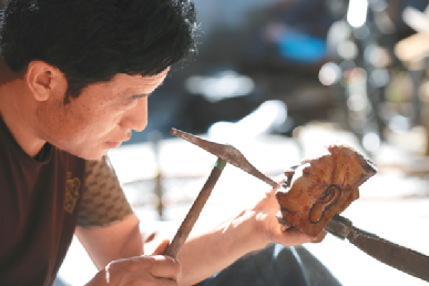 20歲前的次嘎已可以承接一些佛像的鍛敲任務(wù),掌握的技術(shù)遠(yuǎn)遠(yuǎn)超出一起學(xué)習(xí)的其他學(xué)徒們。從鍛敲佛像的蓮花底座、焊接,再到鍛敲銅佛造像上半身、下半身,再到慢慢地開始做些佛像飾物。偶爾,次嘎也能涉獵造像的臉部。這是一個(gè)造像師手藝達(dá)到最好時(shí)才可以觸及的部位?!懊娌拷Y(jié)構(gòu)復(fù)雜又微妙,面部表情的刻畫更是難上加難。作為一個(gè)造像師,這是最考驗(yàn)功力的地方,每一次敲打都在決定作品的成敗。”次嘎說道。