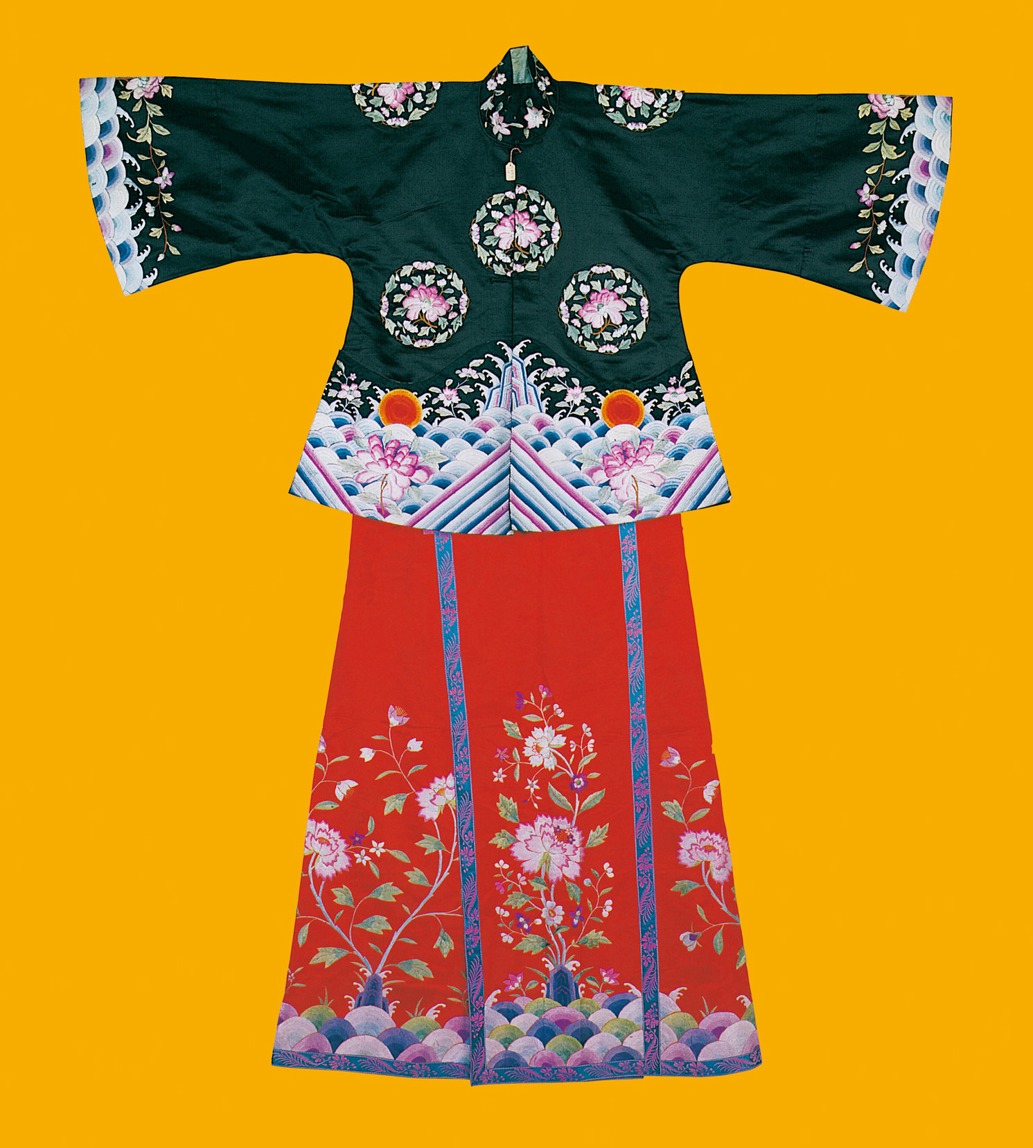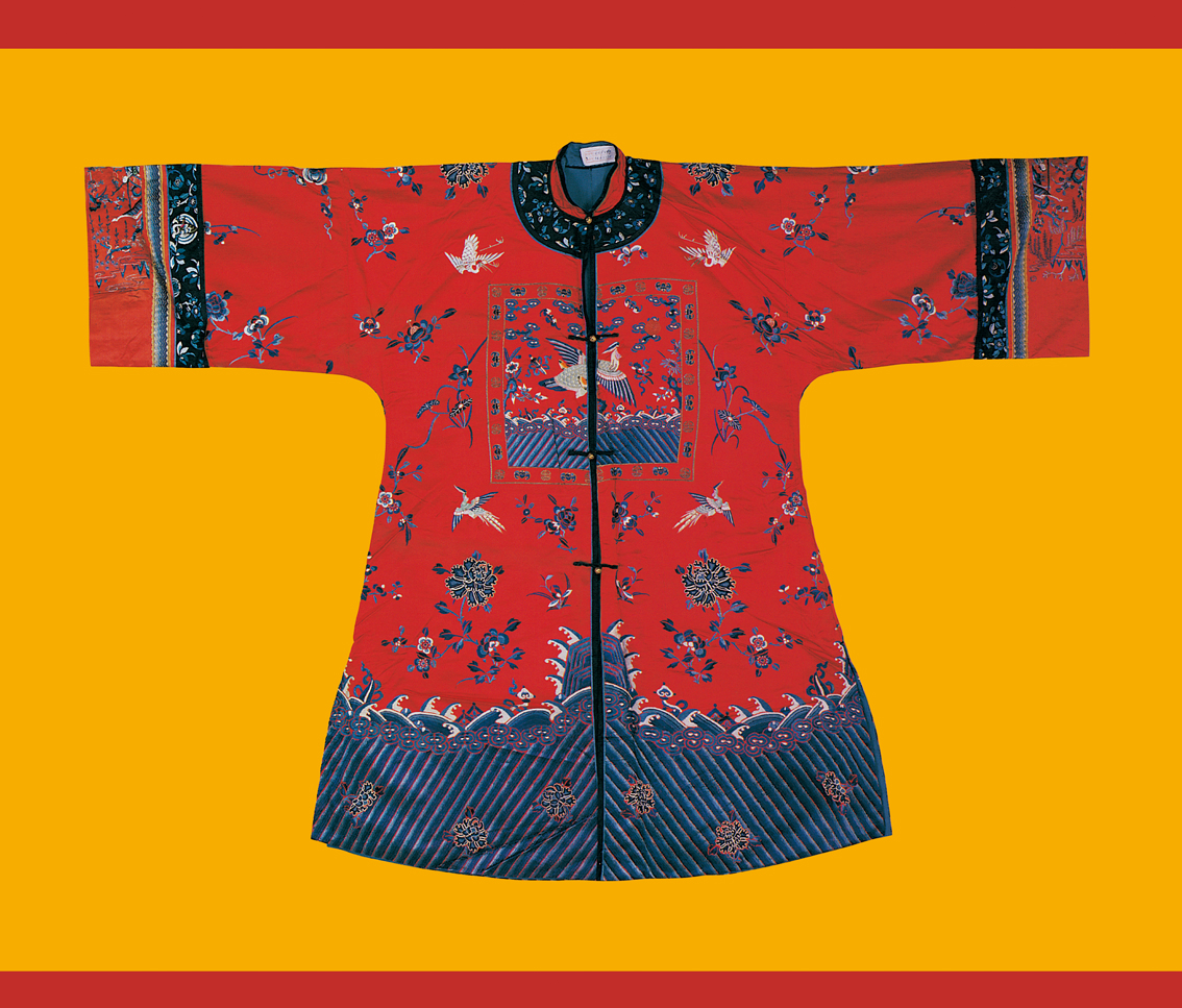 元代,作為民族大融合和中外文化大交流時期,長衣統(tǒng)稱為袍,其樣式南北方差異不大,但材料貴賤精粗,卻差距懸殊。漢族男性發(fā)式變化不多,但北方的漢族女性發(fā)式較前簡化。在元朝并沒有完整的冠服制度。蒙古人入主中原后仍保持其生活習(xí)俗,但同時又受漢族的影響,服飾日趨華麗。在大宴活動中,天子百官要穿統(tǒng)一顏色的服裝,稱為“質(zhì)孫服”,其形為袍襖狀,與漢族深衣相近(圖為漢族清代牡丹紋緞繡女裝,中央民族大學(xué)民族博物館館藏)。