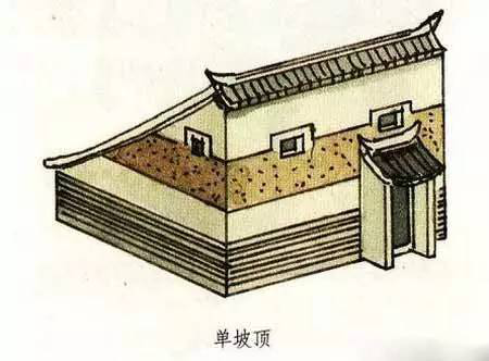 單坡頂就是只有一面坡的屋頂。它與我們常見的兩面坡屋頂有較大的不同,但從一面來看又有極大的相似性。我們甚至可以說,單坡屋頂就像是兩面坡屋頂被從中間一切兩半了。單片屋頂一般都用在不太重要的建筑或是附屬性的建筑上。在已發(fā)掘的商代宮殿遺址中,可以看到在商代即有單坡頂?shù)睦茸恿?。而現(xiàn)在的陜西、陜西等地的農(nóng)村,許多民居仍然使用單坡式的屋頂,成為現(xiàn)今較富有特色的一種民居形式。