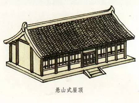 懸山式屋頂與硬山式屋頂一樣有一條正脊和四條垂脊。不過,它又有不同于硬山式屋頂那樣與山墻平齊,而是伸出山墻之外。這部分伸出山墻之外的屋頂是由下面伸出的桁(檁)承托的。所以懸山式屋頂不僅有前后出檐,在兩側(cè)山墻上也有出檐。懸山式是兩面坡屋頂?shù)脑缙谧龇?,不過中國古代的重要建筑基本沒有使用懸山式屋頂?shù)模貏e是唐代以前尤為少見。
