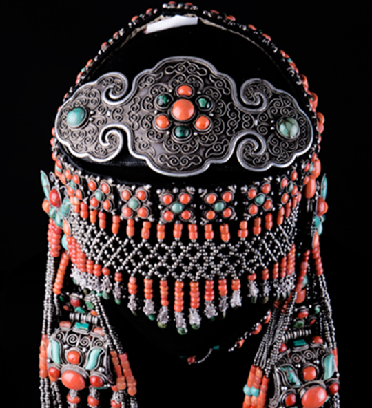 頭箍飾:是整個(gè)頭箍是頭飾的中心骨架,也是頭飾的中心飾件,飾于頭圍,呈圓扁形環(huán)狀飾帶, 多以青色綢緞布打成袼褙后剪制成底襯, 與頭圍周長相吻合。在其表面以綢面貼飾,再依個(gè)人愛好在頭箍外緣表面上, 釘綴銀托。銀托可分三種:其一為圓形鏨花掐絲云紋銀托,其銀鏨花中間為圓形環(huán)飾, 間鑲嵌呈半圓體形紅色珊瑚珠,由白色銀鏨托飾托起, 釘綴在青色綢箍之上, 青、白、紅相映, 艷麗無比;其二在銀鏨托花飾正中,有一個(gè)較大的銀鏨托花正好飾在額前雙眉之上,呈桃形銀鏨托花,上鑲嵌半圓體形珊瑚珠,并在珊瑚珠周圍鑲嵌葉片形綠松石珠,從整體造型來看似一串水晶般紅綠葡萄在額前閃耀, 十分華麗;其三在前額頭箍處, 于半圓形浮雕式的銀鏨花托間隔金剛杵形銀托座, 在托坐之上鑲嵌長圓柱形的珊瑚珠, 美觀莊嚴(yán), 具有宗教含義。