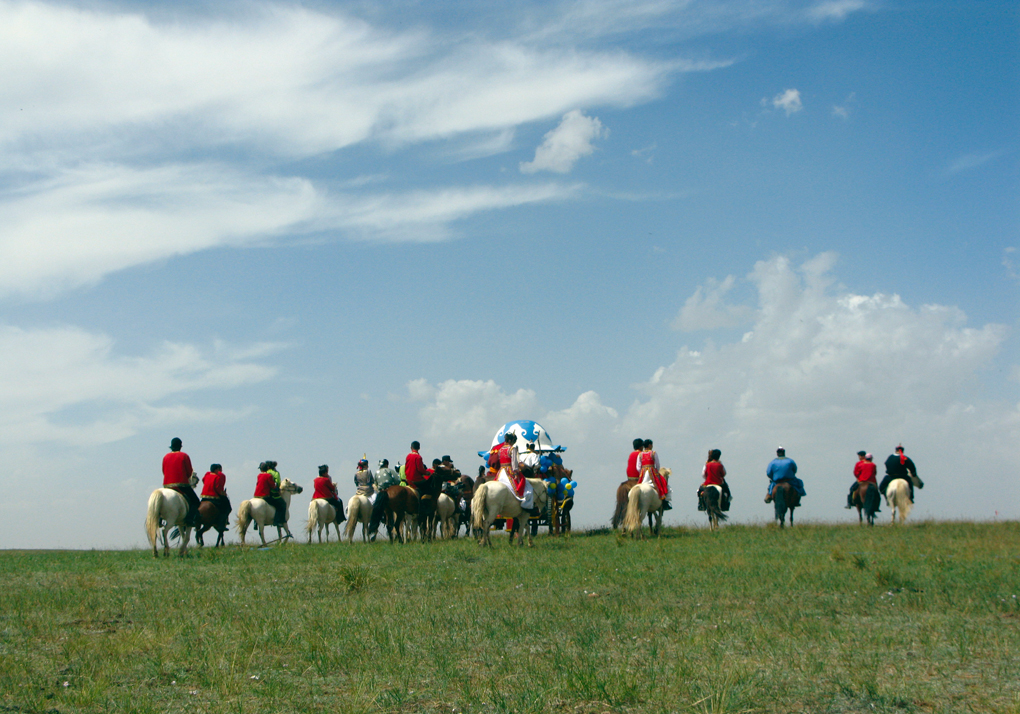 女方家最盛大的婚宴就要開始了。宴畢,新娘就要出嫁。所以也稱“離娘宴”。同時(shí)也意味著新郎要迎接最后一道過關(guān)考試。先輪流給賓客叩頭敬酒,接受女方家親戚贈(zèng)送的衣服佩飾,穿上才可以娶走新娘。進(jìn)膳時(shí),新郎必須當(dāng)眾掰開一個(gè)半生不熟的羊脖子,一般羊脖子里總要塞根紅柳棍,以考驗(yàn)新郎的腕力和智力。宴后,新娘就要登程,女友們把新娘團(tuán)團(tuán)圍住,進(jìn)行“阻嫁”,男方奮力搶親。之后,開始裝扮新娘。館頭額吉解開新娘的大辮,蘸著碗里的清水,梳得油光凈亮,把鏈垂頭飾戴上,意味著少女時(shí)代就此結(jié)束,今后將以少婦的形象出現(xiàn)。女方送親的人準(zhǔn)備好騎乘,在悠揚(yáng)的禮贊聲中,蒙著紅紗的新娘由倆位胞兄牽著,緩緩穿過人群上了紅馬,向婆家走去。這時(shí),女方賓客唱起惜別的歌為她送行,直唱得新娘淚如雨下,不時(shí)地停馬回望【圖為四子王草原接新娘馬隊(duì),趙文耀攝】。