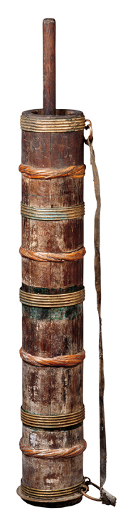 酥油茶是藏族最普遍的飲料。一日三餐、接人待客,都離不開酥油茶。酥油茶的制作各地不盡相同,西藏人打酥油茶時,先將磚茶熬成茶水濾掉茶葉,在特制的酥油桶內放適量的酥油、鹽和開水,再將茶水倒入酥油桶內,然后用特制的木棒上下攪拌,直到茶水和酥油完全相溶即可。而甘青一帶藏族是先將茶盛在碗里,然后加酥油,喝時一邊吹碗邊的油,一邊喝,添數(shù)次茶水后,酥油也喝完了(圖為打酥油茶桶)。