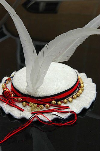 白馬藏族的明顯標(biāo)記就是婦女頭上都戴有頗有特色的盤形荷葉邊的白帽,是羊毛做的,叫“盤盤帽”,又叫“蟬皮帽”,帽子的直徑有15公分,高2-3公分,上面纏有紅、藍(lán)、黑三色的彩帶,而且飄揚(yáng)在帽緣外5-6公分,女性的帽子還繞上珠飾或銅鈕,這種帽子既不保溫,又不能遮擋風(fēng)雨,一年四季都帶,純粹是裝飾,帽子上插著吉祥的錦雞頸羽或者雄雞白色尾羽,寓意為吉祥。為什么白馬藏族帽子上要插錦雞頸羽或者雄雞白色尾羽呢?
