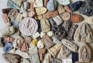 我在曼谷一家有40年歷史的佛像店“佛光工藝社”采訪時(shí)問(wèn)到老專(zhuān)家這樣一個(gè)問(wèn)題:泰國(guó)現(xiàn)在大概有多少種圖案的帕肯?所有聽(tīng)到這個(gè)問(wèn)題的人都是一聲驚嘆,然后笑說(shuō):“無(wú)數(shù)!”我非要問(wèn)出個(gè)數(shù)來(lái),他們便告訴我,泰國(guó)是一個(gè)歷史劃分復(fù)雜、族源廣博的國(guó)家,因此其包容性很強(qiáng),雖然九成以上的人信仰佛教,但是婆羅門(mén)教、道教、伊斯蘭教、基督教等在泰國(guó)都被接納,還有本土的一些法術(shù)也不曾被丟棄。所以,每天每個(gè)來(lái)定做的人都會(huì)有不同材質(zhì)的要求,不同圖像、符咒的組合,僅一個(gè)工藝社40年來(lái)就已經(jīng)做過(guò)幾十萬(wàn)種的圖案組合。我收藏的擦擦有不同年代、不同材質(zhì)、不同價(jià)值的,除去年代久遠(yuǎn)的,頗有價(jià)值的就是一個(gè)藥擦,那是一個(gè)大威德金剛擦,專(zhuān)家說(shuō)從被剝落的剖面看,里面有藥材的成分。我知道,在西藏,擦擦因材質(zhì)和制作人不同而有很大的區(qū)別。擦擦中最為稀有難求的一種叫“布擦”,那是寺廟僧人在保存活佛法體的時(shí)候,將那些浸透活佛法身血水的鹽巴或其它藥物和泥土融合后制成的。另一種較為珍貴的擦擦是活佛的骨灰與泥土摻混在一起制作而成的。還有一種藥物擦擦,是用不同的名貴藥材如珍珠、瑪瑙、藏紅花等藏藥合成制作,可服用治病。最普通的擦擦用一般的泥土制作,好一點(diǎn)的有膠泥、陶土、白泥等,這種擦擦成本低廉,在民間流傳最廣。