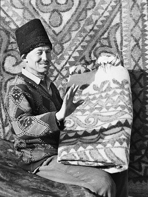 這時,亞生已經(jīng)開始了第二步,他把彈好的羊毛鋪勻,開始噴灑開水。只見他熟練地把水噴向羊毛,然后和妻子一起快速把簾子卷好,用羊毛繩綁緊,再用腳踏著卷好的簾子在平地上來回踏蹬,這樣不停地重復后,做成了氈坯。亞生停下來解開簾子,拉平氈坯,修整好邊角,又灑上熱開水,把氈坯卷起,這是工藝最關(guān)鍵也是最后一步——他們一起跪在簾上,用雙臂反復搓滾氈坯,感覺已經(jīng)平整了,夫婦倆又齊心協(xié)力把氈坯展開拉平,放到院子里。此時,亞生長出了一口氣,抹抹頭上的汗說:“晾干了就可以賣了!”