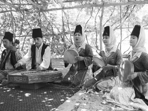 在新疆夏日綠色的葡萄架下,或是在鄉(xiāng)村、城市的茶館或飯館中,熱愛木卡姆的人們無論是荷鋤歸來或是工作歸來,都會拿著樂器,在鏘的彈奏者周圍引吭高歌。那時,木卡姆的聲音就徘徊在小巷路口,聞聲駐足的人有時就忘了回家,圍觀的小“巴郎子”(意為“小伙子”)忍不住沖進去,用可愛的舞姿引起歡聲一片,這時鏘的演奏也就越發(fā)高吭而明亮。
