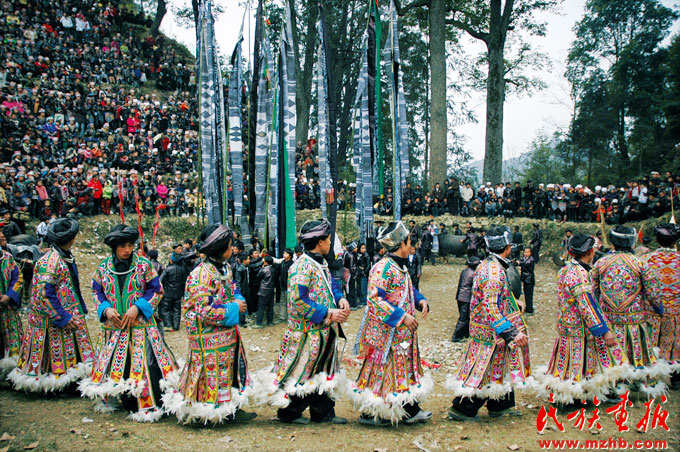 苗族的歲時(shí)節(jié)慶獨(dú)特鮮明。傳統(tǒng)節(jié)慶按功能可分為:物質(zhì)交流節(jié)慶;男女社交、戀愛(ài)、擇偶節(jié)慶;祭祀性節(jié)慶;紀(jì)念性、慶賀性節(jié)慶。