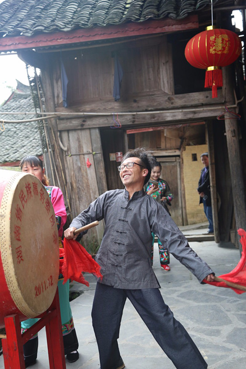 在“幸福人家”客棧門(mén)前,楊超文與妻子神采飛揚(yáng)地敲響了苗鼓