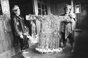 百鳥衣傳承人姜老本(右)在展示自己制作的苗族百鳥衣