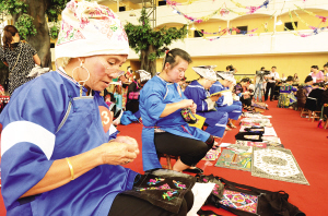 經(jīng)過層層選拔出的100名繡娘在此飛針走線,同秀技藝,展現(xiàn)了少數(shù)民族民間文化獨特的藝術(shù)魅力。