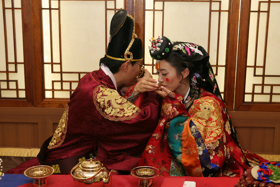 定婚前,提親、定吉日、送聘禮等程序是不能少的。這一環(huán)節(jié)一個重要的禮節(jié)叫作“納彩”,指的就是定婚時,男方家向女方家提親送禮物。朝鮮族姑娘和小伙子的接觸傳話,需要一個“媒人”。與漢族的“相親”相似,男方家要讓媒人到女方家“看善”,如果滿意,小伙正式向姑娘求婚,女方若也同意,男方家就往女方送“四柱”。四柱就是在一張紙上寫著姓名和星辰宿象(出生的年月日時),女方再拿姑娘的四柱與之對“穹合”。所謂“穹合”,就是指男女的屬相是否相順而不相克。