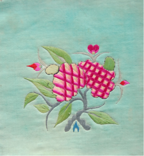 1.平針繡,又稱“直針”,是滿族枕頂刺繡最基本的針法之一,它能準(zhǔn)確地表達(dá)植物花卉、動(dòng)物禽獸、人物、器物等。在所有針法中,平針是分布最廣、使用范圍最大的針法。它的運(yùn)針方式是起針、落針都在圖案的輪廓邊緣,針腳排列均勻,線跡平行,不重疊交錯(cuò),紋樣之間的線條靠空出地面來表現(xiàn)。