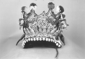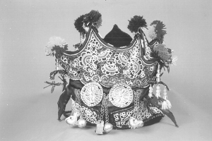 繡花帽由里外兩部分組成,素有“制做繡花帽,先做好襯套”之說。即先按兒童頭徑大小制襯套,做法較簡單,用染過的家織布做里襯,鋪上薄棉,外層為紅綢面,用線依次納緊,以防棉花下滑,縫成筒狀后,頂部用同樣的材料剪成四方形,與上部帽沿結(jié)構(gòu)相同即成。后部分較前部分復(fù)雜,先將染過的兩層家織布粘牢,表面貼上各色緞面,顏色自定。把圖樣拓在緞面上,剪下形狀不同的6片材料,把喜愛的圖案描繪在上面,接著用紡車紡出6根各4米長的棉線,用吊砣逐根旋轉(zhuǎn)纏繞白色呢絨線,經(jīng)濃縮,每根僅得到1米左右線料,將這制好的精線按圖案盤弄,后以花針固定,再輔以其他色線刺繡成圖案點(diǎn)綴其間。把繡好的6片材料組合到襯套上,各片邊沿用黑白兩色線交替鎖邊,帽口用黑金絨布滾邊。此時,帽頂?shù)模吨患饨怯貌噬€制做成圓球裝飾,外面四角下面懸吊白色珍珠串,末端垂著布制五角星。帽的周邊釘上銀制品,最后鑲上反光小圓點(diǎn)飾物似天上星星般光亮,給本就精致美觀的繡花帽增添了一道靚麗色彩,繡花帽就這樣在侗家女的手中誕生了。