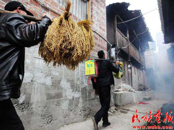 賀禮是街坊鄰居送給新娘家的禮品,在婚禮結(jié)束后的第一天下午進行。送賀禮由中老年婦女承擔,送時或單獨或結(jié)伴而行,禮品或手提或裝在竹筐里,一般都要帶上若干份,每戶一份,一次送完。禮品送到新娘家后,新娘家要進行登記并送幾塊餅干糖果以表謝意。