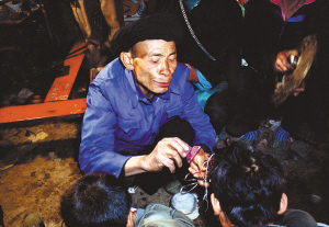 這天,我們剛好在縣里采訪,聽(tīng)說(shuō)高良鄉(xiāng)瑤族村寨要舉行度戒活動(dòng),于是就直奔瑤寨而去。一進(jìn)寨子,馬上感覺(jué)氣氛不同。瑤族婦女們頭戴別致的大銀盤(pán),身著盛裝,真像過(guò)節(jié)一樣。經(jīng)了解后,得知寨子里共有十幾個(gè)男孩要參加這次度戒。寨子里的一位老人告訴我們,一般情況下,只是兩三人,這樣多的男孩一同舉行度戒儀式是很難碰到的。看來(lái),我們的運(yùn)氣還真不錯(cuò)。我們來(lái)到度戒地點(diǎn),見(jiàn)到將要度戒的十幾個(gè)男孩集中在一起,用棉被蒙著頭,不能見(jiàn)陽(yáng)光,要等儀式完后,才能見(jiàn)陽(yáng)光。