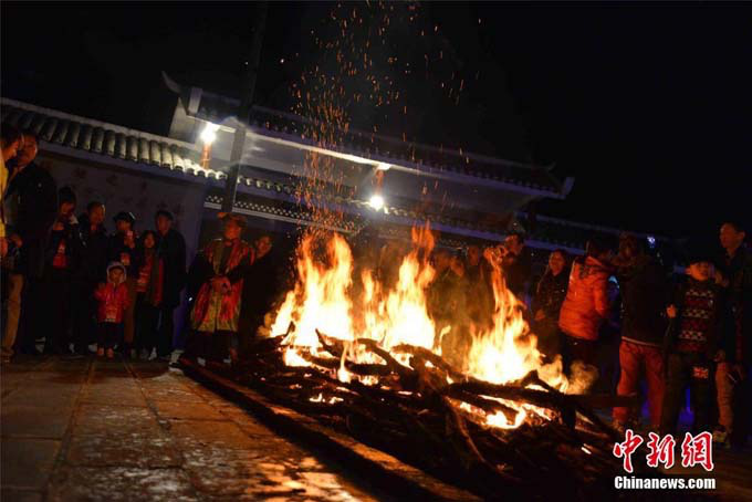 12月6日夜晚,在中國(guó)瑤族之鄉(xiāng)廣西金秀瑤族自治縣瑤族百姓在盤王節(jié)上,展現(xiàn)當(dāng)?shù)噩幾迕耖g絕技——下火海