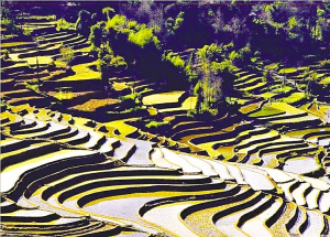 “萬丈梯田,直撲云天,仿佛一道道天梯……”這些經(jīng)典詞匯,一但當人們贊美梯田時,就會不厭其煩地用上它們:“細碎精巧的漣漪……精凈如鱗的波紋……金色的碎片綴滿山體……滿山流光溢彩……”但是,梯田的寧謐、靜美,是屬于前現(xiàn)代性的,當現(xiàn)代性在山腳窺伺并最終漫上梯田社會,一切都將發(fā)生改變。
