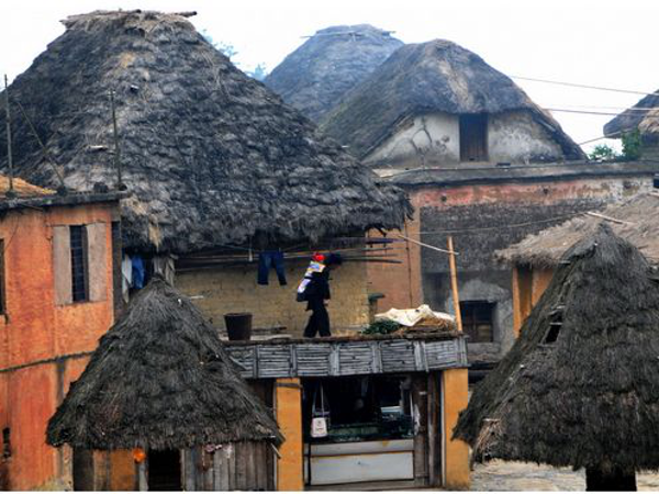 蘑菇房由土基墻、竹木架和茅草頂組成,屋頂為四個斜坡面。房子一般分三層:底層關(guān)牛馬堆放農(nóng)具等;中層用木板鋪設(shè),隔成左、中、右三間,中間設(shè)有一個常年煙火不斷的方形火塘;頂層則用泥土覆蓋,既能防火,又可堆放物品。蘑菇房造型美觀,別具一格。冬暖夏涼。