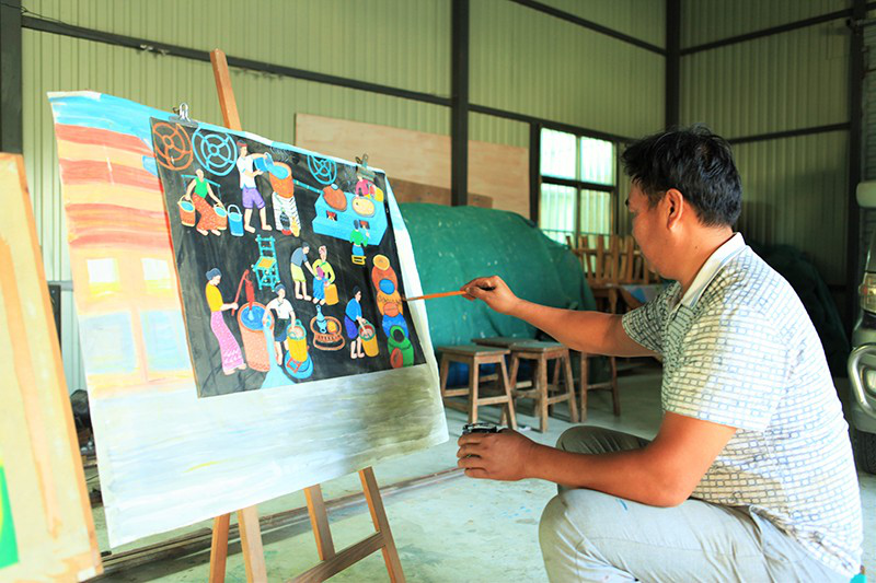 喊沙寨的農(nóng)民畫家吞也正在作畫,畫中描繪的是傣族群眾的釀酒過(guò)程