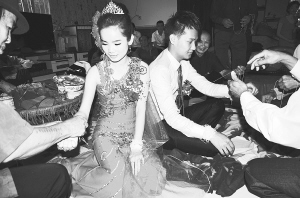 2013年11月19日,在人們“水——水——水——”的祝福聲中,漢族小伙子戴龍與傣族姑娘玉金喜結(jié)良緣。在云南西雙版納傣族自治州景洪市曼嘎村舉行的傳統(tǒng)傣族婚禮上,長輩們紛紛為新人誦經(jīng)、拴線、灑水祝福。
