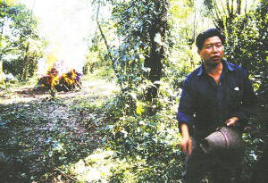 進(jìn)入墓葬地,茂盛的野草,蔽日的樹林,不時(shí)進(jìn)入眼簾的墳堆,還有一伸一縮往人腳上爬的螞蟥,讓人毛骨悚然。來到一塊剛砍過的開闊地,中央挖了一個(gè)坑,里面滿是倒插著的樹柴,柴堆上還放著兩個(gè)舊汽車輪胎。巖化告訴我說:“一次火葬需要兩拖拉機(jī)柴,如果死者家里沒有柴,我們就會(huì)每家湊一兩根,直到湊夠?yàn)橹?。用車輪胎是為了更好的燃燒。”人們把棺材停放在柴堆的左?cè),將“恒叫”取下,巖約將棺材蓋板掀開,用從家里帶來的一個(gè)竹筒里的水朝死者臉上倒。巖約告訴我:“這是給死者洗臉,幫她打扮一下?!比缓螅蠓馉旈_始念經(jīng),經(jīng)文的大意是:“山上的神啊,我們的親人到這里居住,你們要好好服侍她,把周圍看管好!邪惡的鬼啊,這里是我們親人應(yīng)有的地盤,你們不得侵犯,你們不要來擾亂!”念完,就一個(gè)人先走了。然后,人們雙手合掌,掌中緊握一根蠟條,圍著轉(zhuǎn)了三圈,婦女們也先走了。邊走還邊相互告誡,不要回頭看,不然死人的鬼魂會(huì)跟著你走。剩下的男人將棺材抬上柴堆,將用白布裹著的死者,頭朝寨子,腳朝外,意思是你已從寨子出來了,以后再也不準(zhǔn)回寨子了。用柴壓著,又把棺材砸碎,將棺材碎片也堆放上去,有人就拿來一個(gè)塑料桶,開始往上潑澆柴油,并從寨子的這方先點(diǎn)火。一會(huì)兒,熊熊的大火便燃燒起來。有人拿著用礦泉水瓶子裝著的酒給大家倒,輪流喝。喝過一圈后,他們摘下一枝樹枝,往自己的衣襟前后拍打一陣,將樹枝扔進(jìn)火里。巖化說:我們要走了,這樣做是把身上的鬼氣趕盡。我也敢緊學(xué)著他們的樣子做了一通,便隨人們離去。