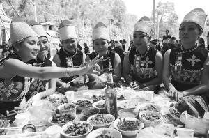 “鳥頭節(jié)”是花腰傣的傳統(tǒng)節(jié)日,村民們通過傳統(tǒng)的祭祀方式,祈求神鳥保佑村寨平安吉祥,來年五谷豐登。現(xiàn)在“鳥頭節(jié)”已注入了輕松、歡快的內(nèi)容。宴席上,大家將鳥頭用木棍插好放在酒瓶中,輪流彈動鳥頭,鳥嘴指向誰,表示誰的運氣好,就要喝下一杯酒。這樣飽含祝福、喜慶的勸酒習(xí)俗,為節(jié)日增添了樂趣。圖為花腰傣姑娘們彈動鳥頭喝酒。