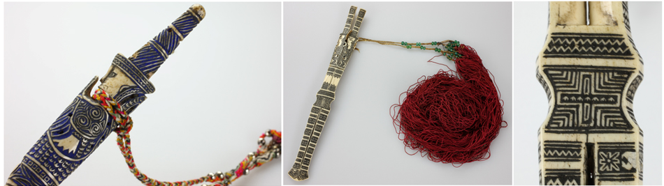 骨簪頭部以下是充滿幾何感的水波紋、山形紋、米字紋、圓形紋,留白之處有魚紋、花紋以及少許文字。文字或是雕刻者本人,或是其心愛之人。一般頭像處或中部系有幾束彩色料珠的紅纓穗飾物用以盤繞發(fā)髻上,或是以銀鈴、銀片來裝飾。