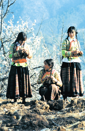 梳頭比賽結(jié)束后,參賽的傈家女才把發(fā)辮盤于頭上,包上傳統(tǒng)的頭帕,然后開始在寨子里織布刺繡了。