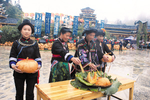 2012年10月28日,貴州省雷山縣達(dá)地水族鄉(xiāng)舉行“走進(jìn)水鄉(xiāng)達(dá)地,體驗(yàn)水鄉(xiāng)風(fēng)情”建鄉(xiāng)20周年慶典暨水族“瓜年”活動?!肮夏辍鄙希?000個大黃南瓜特別引人注目。大南瓜營造了濃濃的鄉(xiāng)情與年味,引得眾多參加節(jié)慶的鄉(xiāng)親、游客紛紛留影紀(jì)念。