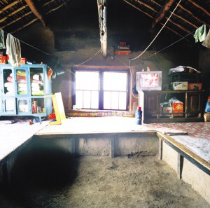 達(dá)斡爾族住房以兩間或三間居多,以西屋為上,不設(shè)北窗。東西兩屋的南面各有3扇窗戶,中間一間在房門兩側(cè)各有一扇窗戶,西屋開兩扇西窗,更利于采光和通風(fēng),這在北方民居中比較少見。兩間房的西屋是起居室,南、西、北三面連炕,成“凹”字形,與滿族的“萬(wàn)字炕”差不多。近些年,達(dá)斡爾族家庭人口少了,特別是結(jié)婚的新房只搭北炕,南面放置組合家具和冰箱、洗衣機(jī)。東屋開南門,作為廚房,砌鍋灶,一般用8印或10印的鐵鍋。煙囪在墻外,與房頂有距離,有的用草垡子壘砌,有的用木板,這樣的煙囪不僅抽力大,灶堂好燒,而且可以避免草房頂?shù)幕馂?zāi)。近十幾年建的房子,煙囪都在西山墻上用磚壘砌,一直伸出屋脊后坡,高出房頂一米多。