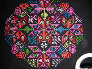 刺繡針法主要有鎖繡、平針繡、參針繡、壓針繡和眉毛花、納紗繡、補花繡、十字繡、編針繡、牽花繡、緝針繡、云子花等。鎖繡針法采用繡線環(huán)圈鎖套而成,即線線成環(huán)、針針套扣,落針在起針旁,最后繡成的紋路效果如鎖鏈結(jié)構(gòu),因而得名鎖繡。羌族鎖繡發(fā)展成為各式針法,并成為羌族刺繡的重要針法。鎖繡主要運用于圍腰上的裝飾紋樣,平針繡又稱“齊針繡”,是繼鎖繡之后另一種古老而傳統(tǒng)的針法。平針繡的繡線排列整齊均勻,不露地、不重疊,以繡跡的絲理顯現(xiàn)紋飾的質(zhì)感,繡紋具有閃光緞面的效果,多用于小塊面的刺繡。參針繡又稱“套針繡”,是在平繡的基礎(chǔ)上增加深淺變化,以表現(xiàn)花、葉等紋樣的明暗,使大面積的紋樣層次豐富而有立體感。在平繡和參針繡的基礎(chǔ)上,羌族婦女創(chuàng)造了壓針繡的針法,她們又稱之為“撇花”。在繡一針長線后,又用一針短線壓在原長線上,并確保每繡一針長線后均在同一位置壓上短線,如編籬笆一般,紋樣邊緣整齊,紋樣內(nèi)的繡線交錯有致,產(chǎn)生富有變化的視覺效果。穿花繡、九針繡,多用于頭帕以及飄帶上。納紗繡的針法是在素色面料上按經(jīng)緯紗線交織的孔進行刺繡,并沿著一個方向施針,如垂直的經(jīng)線方向或水平的緯線方向,通過露出面料地色而形成花紋。補花繡又稱貼花繡、貼布繡。羌族婦女稱之為“拼花”,即將色布拼接后形成花紋。補花繡制作簡便,紋樣簡潔大氣,裝飾效果強烈。制作時,將剪好的色布貼于服裝、鞋面所需要裝飾的部位,然后用鎖扣繡、結(jié)邊繡或緝針繡的針法固定色布。十字繡又名挑花、架花、數(shù)紗繡,在羌繡中占有重要地位,十字繡繡品種類多、數(shù)量大、表現(xiàn)的內(nèi)容非常豐富。羌族十字繡,既有嚴密的構(gòu)圖,又有豐富的內(nèi)容、對比的色彩和精彩的紋樣,還有精煉而靈活的針法。類似十字繡的刺繡,繡線相互編織、交錯、重疊,繡線排列、交織勻稱,交錯的繡線如同編織的網(wǎng),可形成各種塊面和線條。牽花繡又稱“纖花”、“兩面花”、“里面花”,即采用單根繡線,繡針按面料的經(jīng)緯線走向,有規(guī)律地來回穿刺,形成上針、下針、順針、回針,繡出的圖案在面料的里和面均呈現(xiàn)規(guī)則的幾何形花紋。緝針繡以回針法運針,即針腳頭尾相接,因此民間又稱為“倒鉤針”。緝針繡要求針腳長短均勻整齊,繡紋自然流暢,此針法多用于補花繡,將補繡的布片固定在裝飾部位。云子花又稱“云云花”,多用于云云鞋鞋面上補花圖案的裝飾。因此,“羌族刺繡既繼承了傳統(tǒng)針法豐富而又嚴謹?shù)奶攸c,又體現(xiàn)了本民族刺繡針法的靈活性與多樣性。