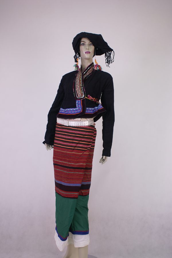 婦女的衣裙與傣族相似,上穿緊身短衣,頭頂挽髻,用頭巾纏頭,喜歡戴大耳環(huán)、銀手鐲等裝飾。姑娘愛(ài)戴野花或自編的彩花,將雙頰染紅。一般,女子上著左右兩祚斜襟窄袖黑色小褂,小褂為圓領(lǐng)、緊腰、寬擺,短及臀部,在左肋下拴線打結(jié),已婚婦女用黑色布料,未婚姑娘喜淺藍(lán)色或白色。里衫為無(wú)袖貼身夾衫,下穿兩條筒裙,內(nèi)裙為白色,外裙有兩色,臀部以上為紅色橫條,腿下為綠色或黑色,用布條或花邊鑲飾。未婚婦女用黑或藍(lán)布包頭;已婚婦女梳發(fā)髻,插銀簪,頂端鑲3顆棱形玻璃珠,下系銀鏈,纏包頭。婦女戴銀耳環(huán)、項(xiàng)圈、手鐲等飾品。