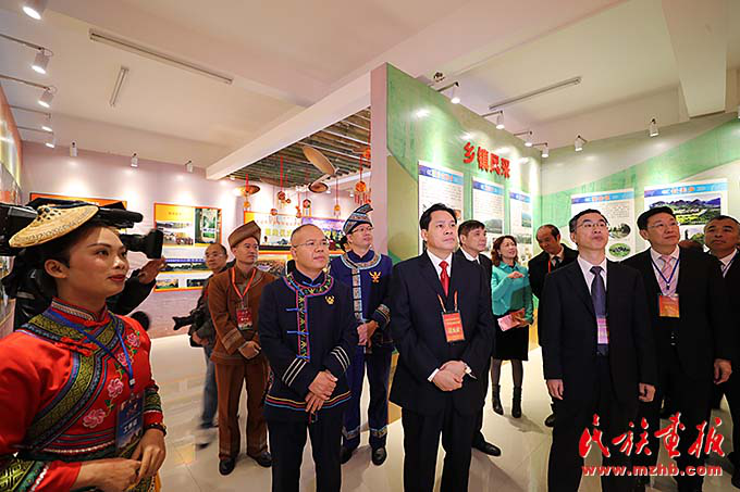參加環(huán)江毛南族自治縣縣慶活動的全國人大民委、國家民委祝賀團(tuán)和廣西壯族自治區(qū)代表團(tuán)、河池市代表團(tuán)成員參觀環(huán)江縣經(jīng)濟(jì)社會發(fā)展成就展