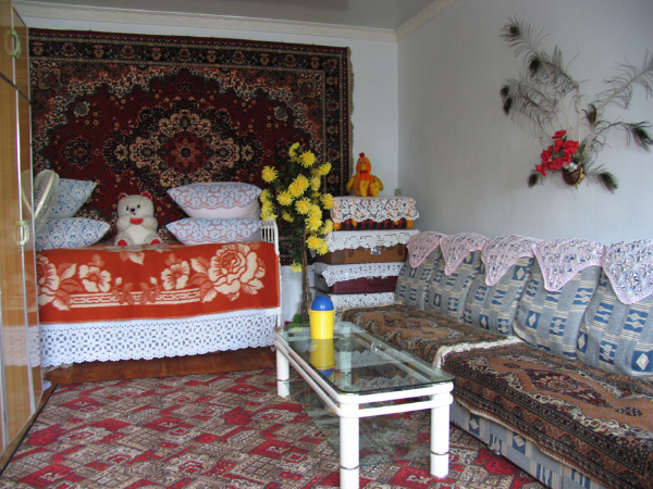 木刻楞房的室內結構一般有客廳、臥室、廚房和儲藏室四部分構成,房屋的整體結構呈四方形,建造有傾斜度較高的屋頂,利于雨雪不會覆蓋在屋頂,從而造成屋頂承重過高而發(fā)生坍塌。此外,俄羅斯族人一般都會選用紅色、藍色或者綠色的鐵皮將屋頂精心包裹一番。這不僅可以起到很好的防風御寒、防止雨雪滴漏進室內的效果,而且也使木刻楞房色彩十分和諧艷麗。房屋的正門之前一般會建造寬闊的門庭和圍廊,門內有過道,過道兩旁是臥室和客廳。室內的墻角有土坯壘砌的火墻。有的人家是大型壁爐,外包一層鐵皮,鐵皮上抹一層黑油,俗稱“毛爐”,是很好的取暖設備。室內陳設比較講究,臥室擺放著木床或鐵床,鐵床欄桿雕有花草圖像,給人以古雅之感。木刻楞房室內一般會在地面鋪上木地板,俄羅斯族人們也十分喜愛在家中鋪設飾有各類花紋圖案的地毯。