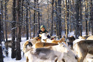 人類馴養(yǎng)馴鹿的歷史有1000多年。這是一種異常勇敢的生靈,生活在北極圈附近,分布在歐亞和北美大陸及一些大型島嶼。在極度惡劣的自然條件下,馴鹿為了繁育后代,每年都要冒著生命危險(xiǎn)長(zhǎng)途跋涉數(shù)百里,其堅(jiān)韌不拔的意志力和不屈不撓的品格正是北極冰原精神的象征。在中國(guó),馴鹿棲息在大興安嶺北段的寒溫帶針葉林中,處于半野生狀態(tài),這里有激流河、阿穆?tīng)柡?、阿巴河、呼瑪河,有阿龍山、奧克里堆山等。食物主要是苔蘚,也吃石蕊、蘑菇及大木植物的嫩枝葉。鄂溫克族的祖先把鹿視為圣潔,賦予其許多美麗的神話和傳說(shuō)。是啊,只要有了馴鹿,鄂溫克人便是幸福的。據(jù)考證, 我國(guó)的馴鹿與貝加爾湖東北部尼布楚河上游溫多苔原高地的馴鹿有淵源關(guān)系。可以說(shuō),鄂溫克人的馴鹿、狩獵、樺皮文化、薩滿教把北極文化延伸到了興安嶺。
