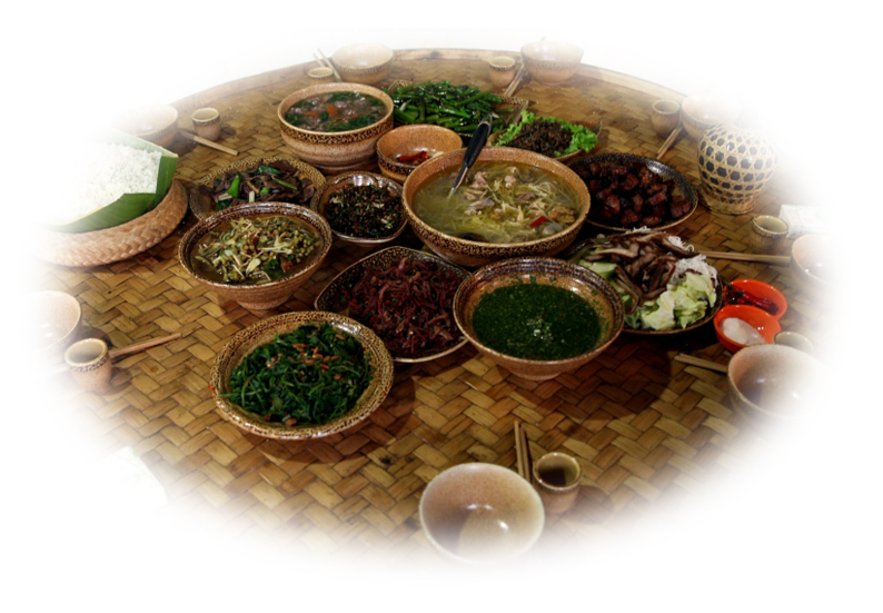 德昂族絕大多數(shù)以大米為主食,部分地區(qū)雜以包谷和薯類。均以蒸燜而食,擅長制作各種糧食制品,如:豌豆粉、豆腐、米粉、年糕、粑粑、湯圓等。蔬菜種類繁多,竹筍是四季不斷的蔬菜之一,除鮮吃外,多加工成酸筍或干筍食用。其他蔬菜的食用,都習(xí)慣于在煮燉時配酸筍,或加油、豆豉、鹽成雜熬菜。酸筍用途十分廣泛,即使在燉雞、炒肉或烹魚時都要加酸筍調(diào)味。受當?shù)貪h族的影響,許多漢族風(fēng)味的腌菜、腐鹵也是德昂族餐桌上常見的小菜。德昂族民間制陶和使用竹編制品歷史悠久,所有炊餐用具,大都是自制的陶器和竹器。