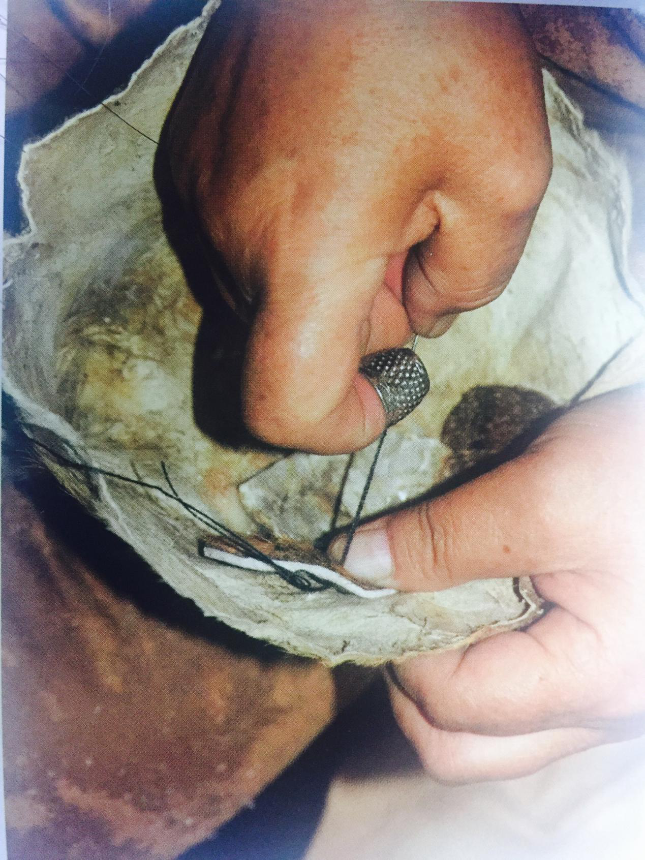 狍角帽是用整狍子的頭顱,去掉骨肉后,保留狍頭上的毛、角、耳朵、鼻子和口,精心鞣制而成。主要制作流程是:剝皮,清洗、熟皮,定型,補(bǔ)眼睛、刺繡、制作繡片,縫合護(hù)耳與頭皮,制作里襯。制作時,如何剝得完整的頭皮,是整個制作環(huán)節(jié)的關(guān)鍵。