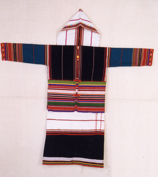 基諾族婦女上衣為無領(lǐng)對開,上半部多采用黑布或白布,下半部及衣袖用紅、藍、黃、白等7色布配制或刺繡而成,用紅色鑲邊,上衣背部縫一塊約3寸見方的白布,上面繡有圓形太陽花式圖案(基諾族稱月亮花);內(nèi)衣為上部呈方形下呈菱形的兜肚式緊身衣,上部方形為鮮艷的條飾花紋,下部菱形繡著各式圖案。下身多著紅色鑲邊的黑色合縫短裙,并用一尺左右的黑布纏綁小腿。發(fā)型為椎髻,婚前髻在腦后右方,婚后髻在前額正中。頭戴披風式尖帽,這種尖帽用長約60公分、寬23公分的豎線花紋土布對折,縫住其一邊而成,戴時又在帽沿上折起一指許的一道邊。