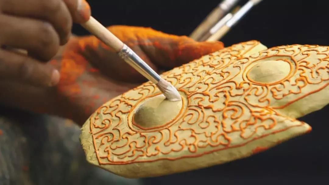 在等待膠布面具晾干的時候,扎西去到了兒子練習(xí)跳舞的地方,在外面遠遠的看著兒子練舞。原本希望兒子繼承他這手藝的心思,在看到兒子真心喜歡藏舞后,也被漸漸放了下來?;氐郊抑?,膠布面具已經(jīng)干透,開始了制作面具中最重要的一環(huán):上顏色。隨后上頭發(fā)、簪子等小零件,一個薩迦面具終于制作完成。