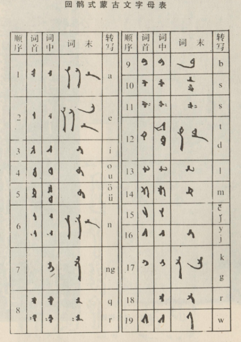 回鶻式蒙古文是一種拼音文字,字母分表示元音和表示輔音的兩大類。書寫時元音字母和輔音字母結(jié)合得很緊,筆畫連在一起,一氣呵成。最小的書寫單位是詞。但早期拼寫法不甚嚴(yán)密,有一個詞分做兩段書寫的情況。書寫格式是從上往下豎寫,從左往右移行?;佞X式蒙古文字母在詞首、詞中、詞末等不同位置上筆畫略有變化,以適應(yīng)連寫的需要。