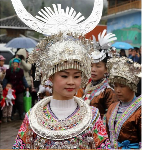 苗族頭飾主要是以銀飾為主。苗族女孩從學(xué)會走路開始,父母就會給女兒制作一套苗族民族盛裝和頭飾,苗族女孩一般6歲左右就可以參加每年的民族盛會,并且從小學(xué)習(xí)化妝技術(shù)。苗族的盛會主要集中在春節(jié)后,也叫坡會,就是山坡上的聚會,這一天苗族姑娘就會穿上珍藏已久的民族盛裝,戴上頭飾,把自己打扮的漂漂亮亮,參加蘆笙踩堂舞,展示自己的美麗一面。