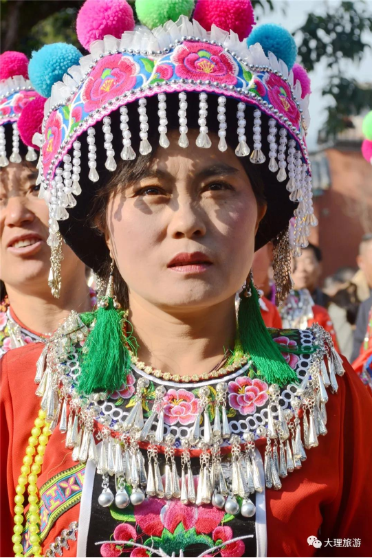 踏歌會(huì)上,來自彌渡彝族聚居地的各村各寨男女老幼穿戴整齊,云集在鐵柱廟,這里便形成了五彩斑斕的彝族服飾比賽場(chǎng),每位彝族婦女的頭飾就是她心靈手巧的見證。