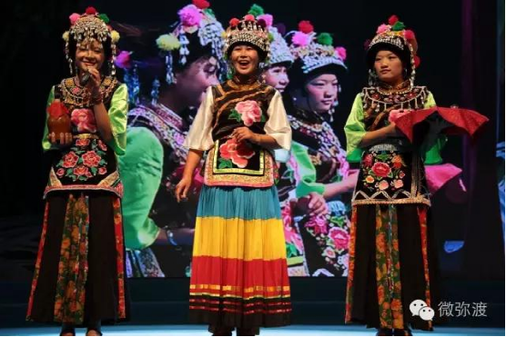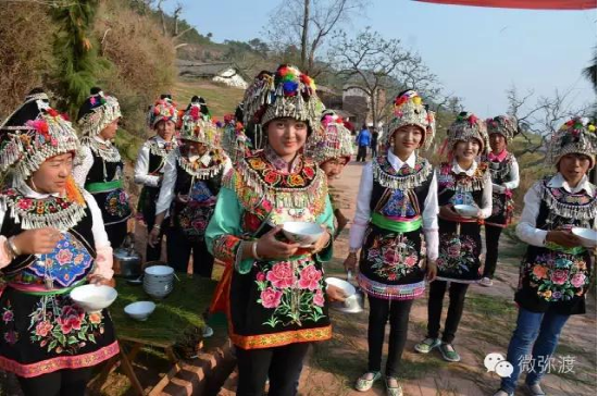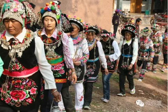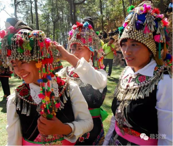 “羅羅潑支”男女服飾的特點:“羅羅潑”男子服飾與“迷撒潑”相差無幾,一般不戴白頭巾。但是婦女的服飾相差卻很大,明顯保留著古樸高雅的南詔遺風(fēng)。頭飾由桂花、包頭、飄帶、大墜子、蜜蜂墜、芝麻鈴組成。桂花墊子在裱布上蒙黑色面料,中間訂有銀飾。包頭以黑色為主,長約2米,后鏈系于包頭,鏈子為銀制。飄帶長約4尺,黑色留花邊,兩頭訂英蘇。包頭還系有大墜子、蜜蜂墜各一對,芝麻鈴20個。領(lǐng)合由裱布黑色面料上訂芝麻玲20個圍在脖子上。圍腰的前胸部,由領(lǐng)口至腹部,左右各垂掛一條綴有串珠、針筒、響篾(口弦)一類飾品和生活用品的銀質(zhì)項鏈。人一走動,全身的小蘇鈴就響,聲音悅耳動聽,形象美觀大方。額頭前還圍有一塊翠綠色的“桂花綁”,綁上釘有銀質(zhì)小泡泡200多顆,羅羅潑支婦女的服飾彰顯華麗之美。